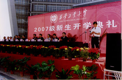 (本網訊)金風送爽,天高云淡,9月14號上午,西安工業大學未央校區彩旗飄飄、歌聲嘹亮,2007級新生開學典禮在圖書館前廣場舉行。校黨委書記賽云秀,校長劉江南,黨委副書記簡林根、丁養斌,副校長張君安、劉建勛、陳俊斌,校長助理陳樺出席,教務處、學生處、校團委及各院系部負責人和2007級新生參加了開學典禮。開學典禮在莊嚴的國歌聲中拉開序幕。