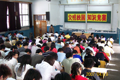 為了進(jìn)一步提高廣大學(xué)生對教學(xué)評估工作重要性的認(rèn)識,積極參加春季文明校園建設(shè)活動,2007年4月10日下午,繼續(xù)教育學(xué)院舉行了文明校園建設(shè)知識競賽活動。參加此次活動的主要是繼續(xù)教育學(xué)院的全體脫產(chǎn)學(xué)生,競賽內(nèi)容緊緊圍繞我校的辦學(xué)歷史、辦學(xué)傳統(tǒng)、辦學(xué)指導(dǎo)思想、辦學(xué)定位、評建知識、文明校園建設(shè)的主要內(nèi)容以及怎樣以實際行動迎接本科教學(xué)水平評估等。
