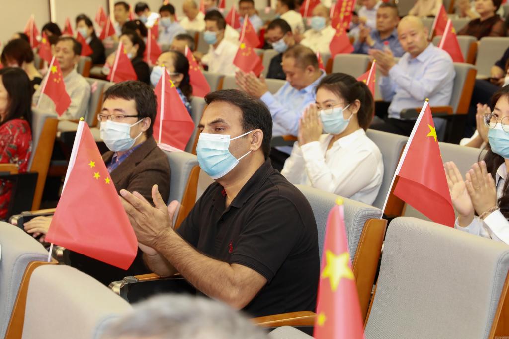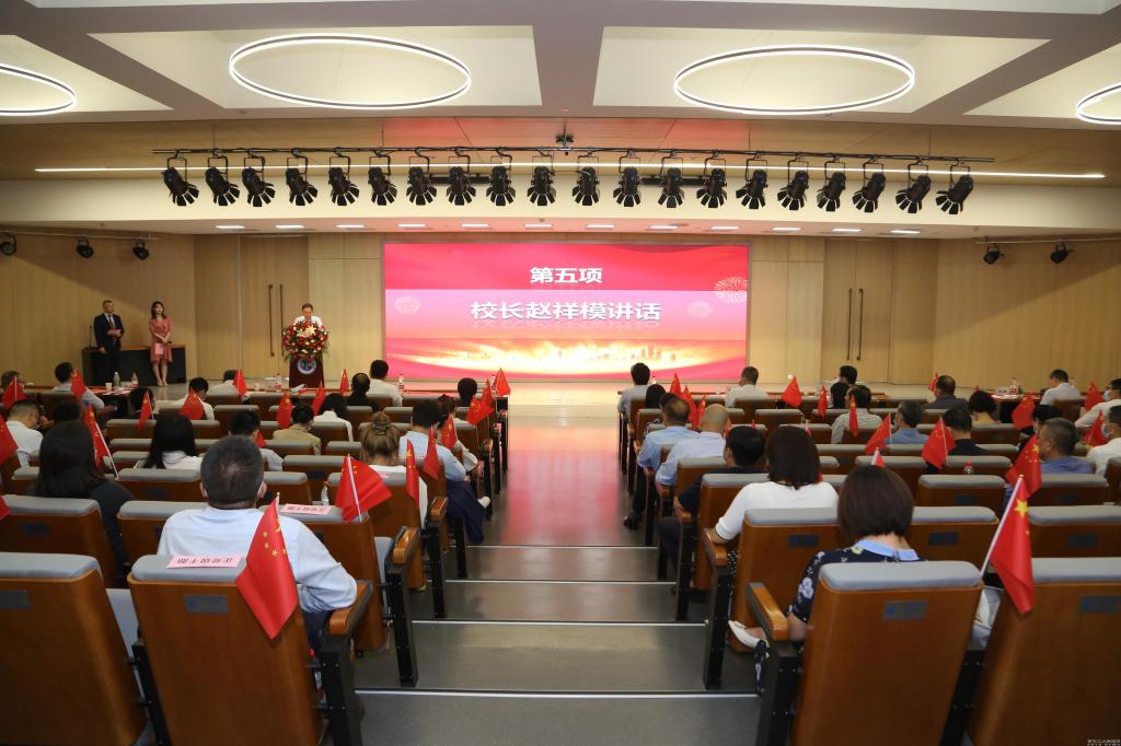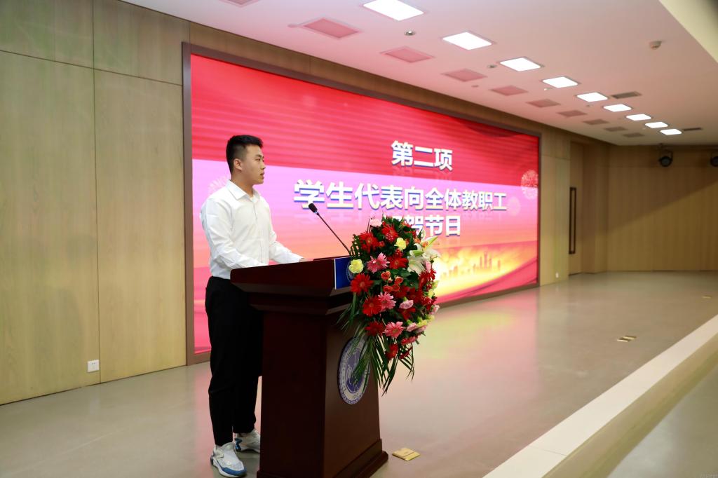 在莊嚴的國歌聲中,大會正式拉開帷幕?;A學院2019級學生賈立瑾代表全校學生向全校教職工表達節日祝福和感謝。