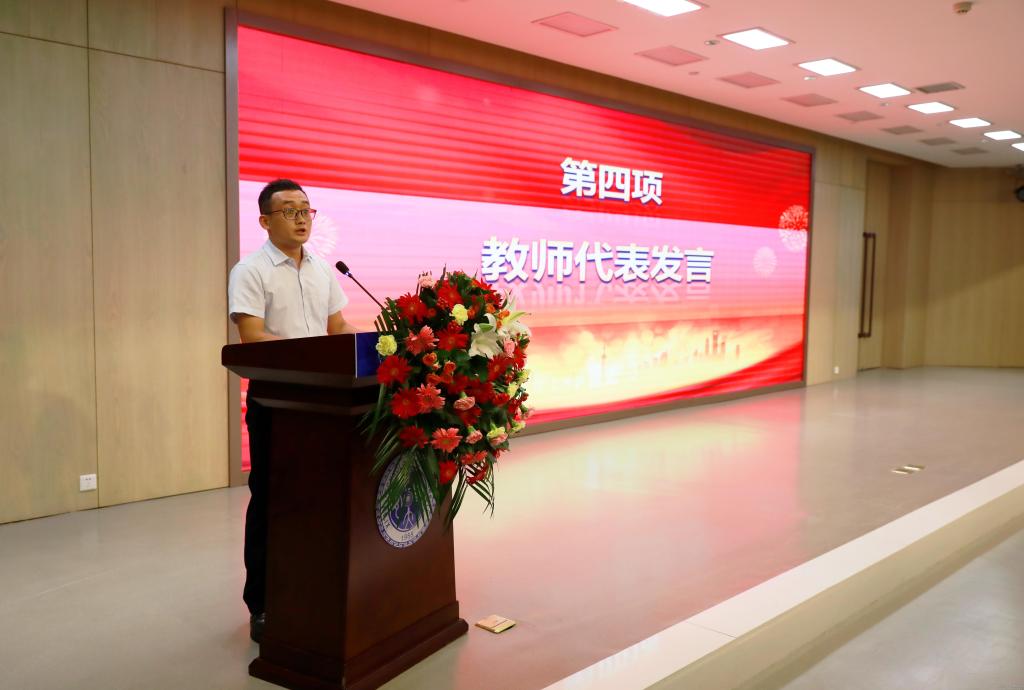 表彰后,獲獎教師代表,機電工程學院張耿發言。他代表青年教師對全校領導、同事送上節日祝福和感謝,號召年輕教師做有溫度、有寬度、有高度的人,秉持“西安工大精神”,落實立德樹人根本任務,為西安工業大學更加美好的明天而共同努力。