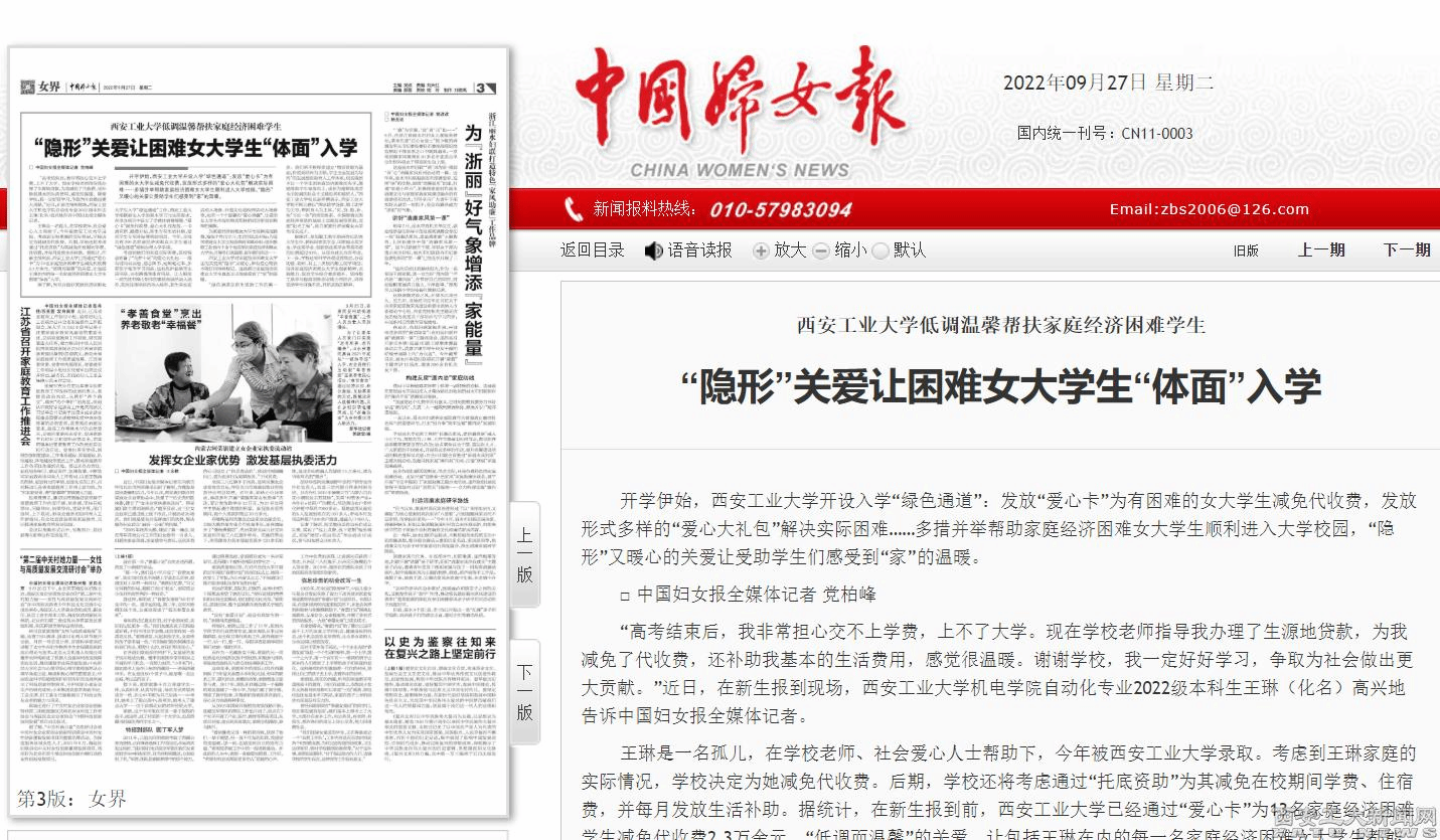 (本網(wǎng)訊)9月27日,中國(guó)婦女報(bào)刊文《西安工業(yè)大學(xué)低調(diào)溫馨幫扶家庭經(jīng)濟(jì)困難學(xué)生“隱形”關(guān)愛(ài)讓困難女大學(xué)生“體面”入學(xué)》,聚焦西安工業(yè)大學(xué)女大學(xué)生資助工作。