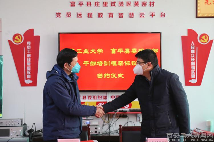 王發合代表學校與王鋒簽署《干部培訓框架協議》。學校黨辦、校辦(鄉村振興辦)主任何春水代表學校與陳興運簽署《黃窯村產業幫扶包裝設計協議》。