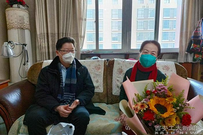 在抗疫志愿服務之星解芳家中,劉衛國緊緊握住解老師的手,親切詢問她和家人的身體健康狀況,嘮家常、問寒暖、敘發展,感謝她離崗不離心,退休不褪色,感謝她在學校抗擊疫情工作中沖鋒陷陣,并向她致以新年祝愿。