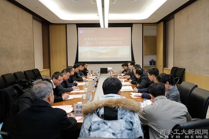 (本網(wǎng)訊)近日,河南平原光電有限公司董事長(zhǎng)郭海星、總經(jīng)理張亞東一行蒞臨我校座談交流,黨委書記劉衛(wèi)國(guó)、副校長(zhǎng)陳建出席座談會(huì),會(huì)議由陳建主持。