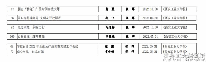 “陜西高校新聞獎”是陜西高校校報優秀新聞作品最高獎,由陜西省高校校報研究會主辦。在此次評選中,楊笑撰寫的《擁有“傳送門”的時間穿梭大師》獲通訊類一等獎;楊飛撰寫的《同心掬得滿庭芳 文明花開校園香》,毛逸彬撰寫的《砥志研思 躬身力行》,李曉燕撰寫的《心有猛虎 細嗅薔薇》獲得通訊類二等獎。張圓撰寫的《學校召開2022年全面從嚴治黨暨黨建工作會議》和常玢超撰寫的《眾心向黨 自立自強》獲得消息類二等獎。