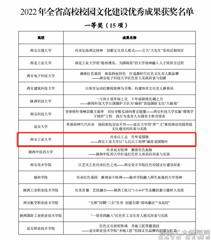 (本網(wǎng)訊)6月19日,陜西省委教育工委公布2022年全省高校校園文化建設(shè)優(yōu)秀成果評(píng)選結(jié)果,我校申報(bào)的《傳承兵工志 升華愛國情——西安工業(yè)大學(xué)以“人民兵工精神”涵養(yǎng)愛國情懷》成果榮獲一等獎(jiǎng)。