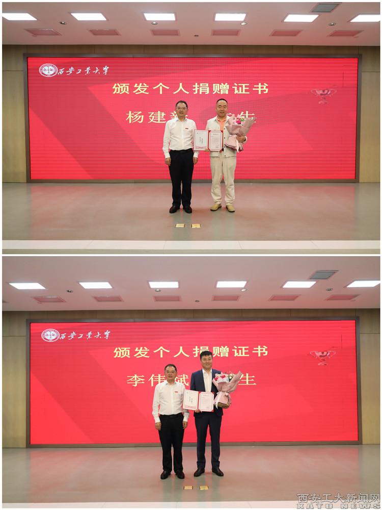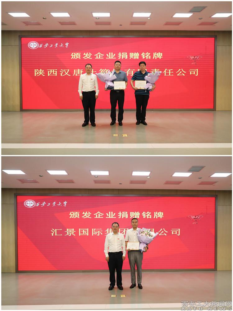 校長趙祥模代表學校致歡迎辭。他介紹了捐贈項目的基本情況,對捐贈企業及企業家的慷慨捐贈表示感謝。他分別向陜西漢唐計算機有限責任公司、匯景國際集團有限公司頒發了捐贈銘牌,向兩家企業董事長楊建新、李偉斌頒發了捐贈證書。