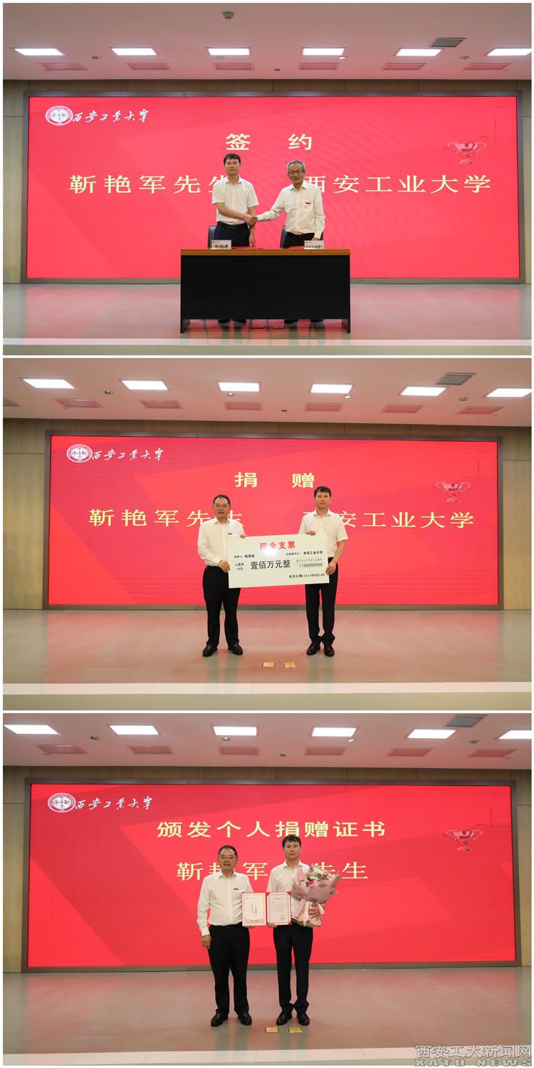 在與會人員的共同見證下,副校長劉卜和中國靳氏集團董事長靳艷軍簽訂捐贈協議。趙祥模代表學校接受捐贈并向靳艷軍頒發了捐贈證書。