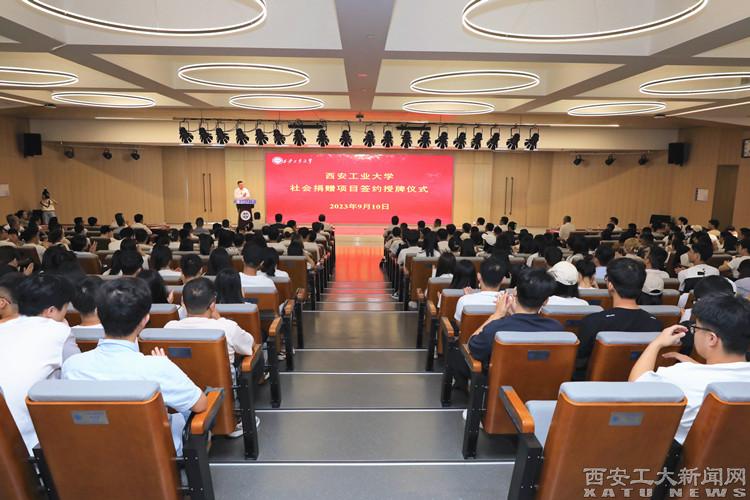 (本網訊)9月10日,我校社會捐贈項目簽約授牌儀式在未央校區圖書館報告廳隆重舉行。陜西漢唐計算機有限責任公司、匯景國際集團有限公司、中國靳氏集團企業董事長及有關負責人,我校全體校領導及相關職能部門和各學院黨政領導、教師和學生代表共300余人參加儀式。儀式由校黨委副書記梁云鶴主持。