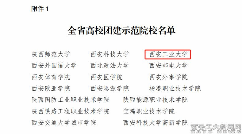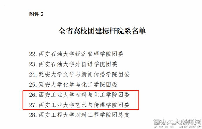 (本網訊)近日,共青團陜西省委、中共陜西省委教育工委聯合下發了《關于全省學校團建示范培育結果的通報》,我校通過驗收被認定為“全省高校團建示范院校”,材料與化工學院團委、藝術與傳媒學院(設計學院)團委獲批“全省高校團建標桿院系”。
