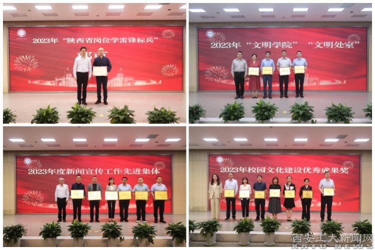 校領導分別為獲得2023年“陜西省崗位學雷鋒標兵”,學校“文明學院”“文明處室”、新聞宣傳工作先進集體和校園文化建設優秀成果獎的代表頒獎。