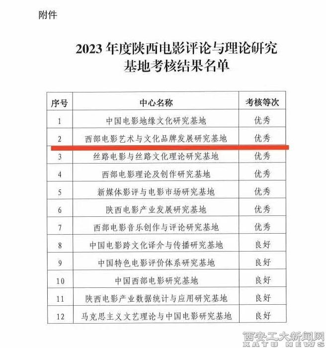 (本網訊)近日,中共陜西省委宣傳部正式公布了2023年度陜西電影評論與理論研究基地考核結果,我校“西部電影藝術與文化品牌發展研究基地”以排名第二的優異成績獲評“優秀”等級。