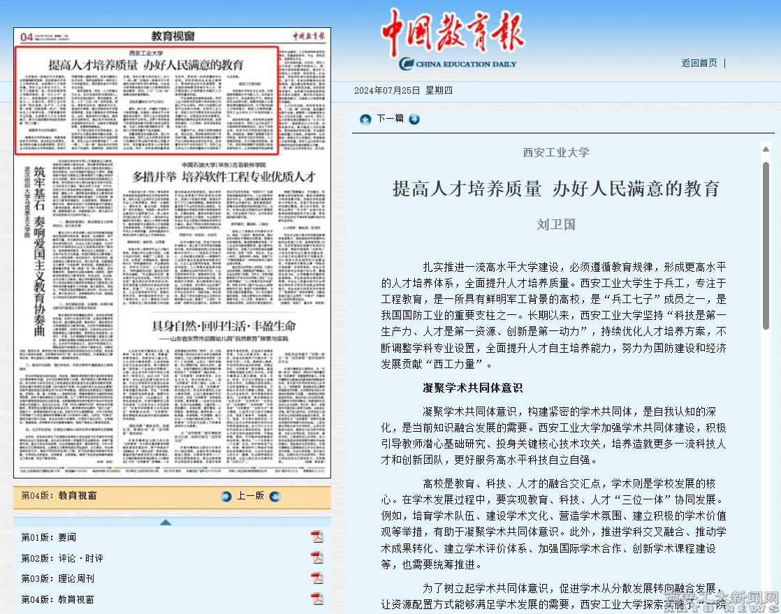 (本網訊)7月25日,《中國教育報》刊登我校黨委書記劉衛國署名文章《西安工業大學:提高人才培養質量 辦好人民滿意的教育》。文章全文如下:
