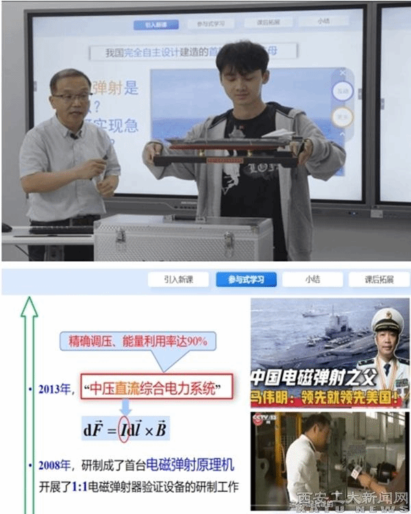 肖宏波在教學中,巧妙地將科技強國、拼搏奉獻的愛國精神融入教學實踐。例如在《安培力》一節中,以我國航母福建艦電磁彈射為例,啟發學生思考電磁彈射技術的基本原理,在航母建設情景案例教學中引導學生深刻感受兵工學子自豪感與使命感。