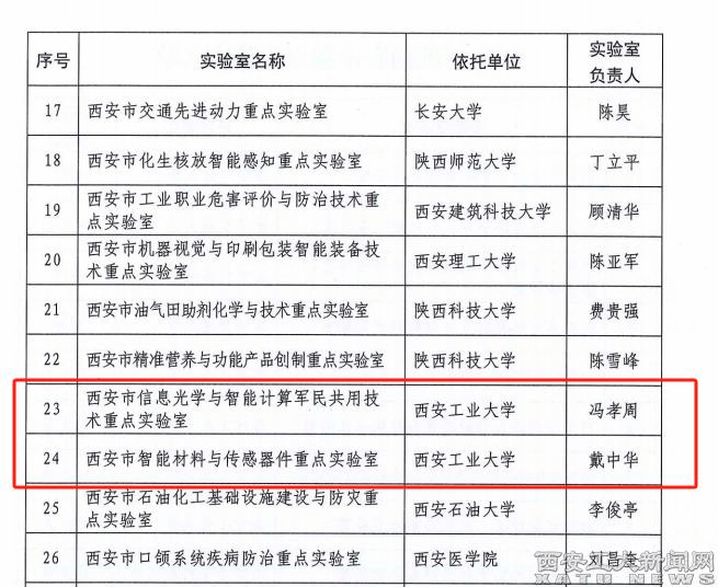 (本網訊)近日,西安市科技局印發了《西安市科學技術局關于認定2024年度市級重點實驗室的通知》(市科發〔2024〕80號)、《關于認定第五批西安市國際科技合作基地的通知》(市科發〔2024〕87號)文件,我校基礎學院馮孝周教授牽頭申報的“西安市信息光學與智能計算軍民共用技術重點實驗室”、光電工程學院戴中華教授牽頭申報的“西安市智能材料與傳感器件重點實驗室”獲批2024年度西安市重點實驗室,光電工程學院惠迎雪教授牽頭申報的“西安等離子體先進光學制造國際科技合作基地”、機電工程學院董皓教授牽頭申報的“西安精密傳動與特種加工國際科技合作基地”獲批2024年度西安市國際科技合作基地。