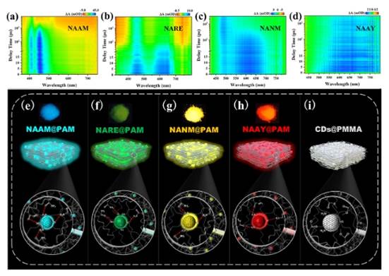 該研究針對基于碳點(CDs)的多色室溫磷光(RTP)復合材料發光顏色單一的問題,提出采用具有獨特梯度共軛結構和固有剛性分子的前驅體,確保了CDs在形成過程中保持共軛結構的完整;研究了共軛區域和氫鍵協同對CDs復合材料RTP發射波長的影響,并通過理論計算驗證了基體限制對RTP的影響。依據計算結果,合成了四種共軛區域逐漸增大的CDs,并將其嵌入聚丙烯酰胺(PAM)基體中,在氫鍵與有效共軛區域協同作用驅動下,實現了從青色到紅色的可調RTP發射,波長調控范圍為465nm到635 nm。