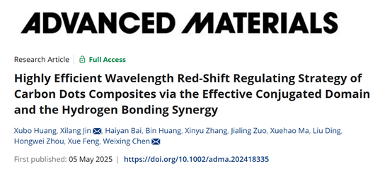 (本網訊)近日,我校材料與化工學院陳衛星教授、金洗郎教授帶領的研究團隊在國際頂級學術期刊《Advanced Materials》(IF=27.4)上發表了“Highly Efficient Wavelength Red-Shift Regulating Strategy of Carbon Dots Composites via the Effective Conjugated Domain and the Hydrogen Bonding Synergy”學術論文。