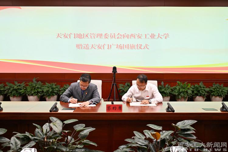 5月23日下午,贈送天安門廣場國旗儀式在北京市人民政府天安門地區(qū)管理委員會舉行,天安門地區(qū)管理委員會黨組成員、副主任(正局長級)姚輝向學校贈送國旗,校黨委副書記馬福代表學校迎請國旗,雙方簽訂《國旗贈予協(xié)議》。我校獲贈國旗編號為“2006-0148”,旗長5米、高3.3米,于2006年4月21日在天安門廣場升掛,當天是我校更名為西安工業(yè)大學暨建校51周年紀念日。