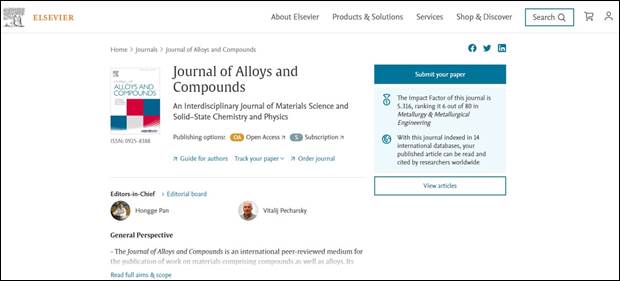 Journal of Alloys and Compounds創(chuàng)刊于1959年,至今已經(jīng)有60余年的歷史,主要發(fā)表冶金、材料等相關(guān)學(xué)科論文,是材料領(lǐng)域發(fā)表論文數(shù)量最大的知名期刊,在冶金領(lǐng)域80多種期刊中排名第6,2021年最新影響因子5.316。