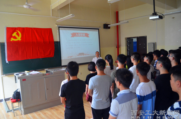鮮紅的黨旗,簡(jiǎn)而有力地為現(xiàn)場(chǎng)渲染出莊重的氣氛。大會(huì)首先由學(xué)生黨員代表張永剛帶領(lǐng)新黨員進(jìn)行入黨宣誓、老黨員重溫入黨誓詞。宣誓過程嚴(yán)肅又莊重,表達(dá)了所有黨員對(duì)黨真摯的情感。