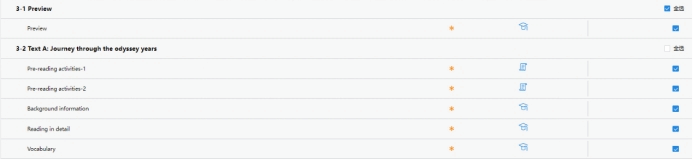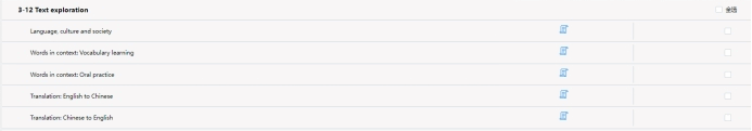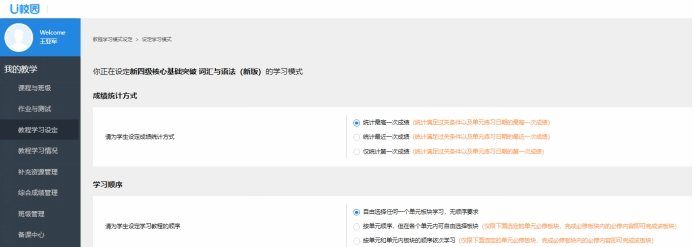 教材出版社提供的U校園和Welearn平臺,不僅呈現(xiàn)了教材的電子版、配備了主題內(nèi)容的音頻資料,師生還可以借助平臺其他可利用資源,如:為了夯實英語基礎,教師在U校園上添加了“新四級核心基礎突破(詞匯與語法)”,同時可以設置學習模式并監(jiān)督學習過程,有效延伸了課堂內(nèi)容,拓展了學生學習空間。