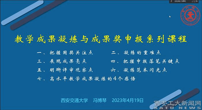 本期名師大講堂特邀國家教學名師、國家級教學成果獎一等獎獲得者、西安交通大學馮博琴教授作“教學成果凝練與成果獎申報”專題講座。馮博琴結合多年的教學成果培育及評審經驗從“什么樣的工作有可能報成果”、“成果如何凝練”、“成果有何特點”、“成果是什么”、“問題怎么寫”等方面做了詳實的分析與講解。
