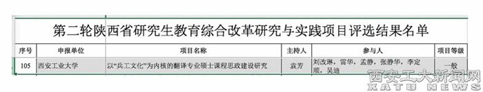 (本網訊)近日,陜西省教育廳研究生處公布了《2023年度陜西省研究生綜合改革研究與實踐項目》立項名單,我校文學院袁芳老師的《以“兵工文化”為內核的翻譯專業碩士課程思政建設研究》成功獲批一般項目。