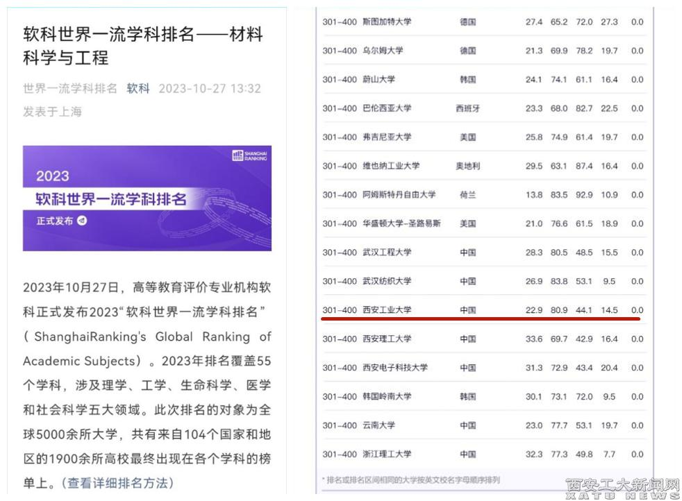 (本網(wǎng)訊)據(jù)2023年10月27日公布的軟科世界一流學(xué)科排名——材料科學(xué)與工程,西安工業(yè)大學(xué)材料學(xué)科軟科世界排名395名,全國排名第144,陜西省排名第6。比去年的世界排名至少提升了100多名。