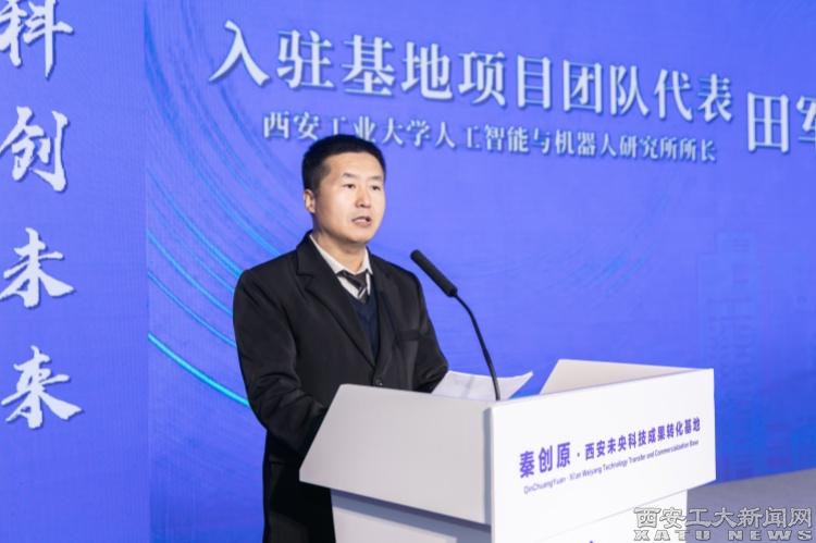 劉發(fā)林代表學(xué)校與未央?yún)^(qū)政府簽訂“基地共建協(xié)議“。學(xué)校人工智能與機(jī)器人科創(chuàng)團(tuán)隊(duì)負(fù)責(zé)人田軍委代表17個(gè)入駐項(xiàng)目團(tuán)隊(duì)發(fā)言。