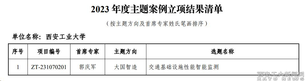(本網訊)近日,教育部學位與研究生教育發展中心發布2023年度主題案例立項名單,入選案例代表了當前案例建設的最高水平。我校建筑工程學院郭慶軍教授擔任首席專家的案例《交通基礎設施性能智能監測》榮獲“大國智造”主題立項,實現了我校該項目立項新的突破。