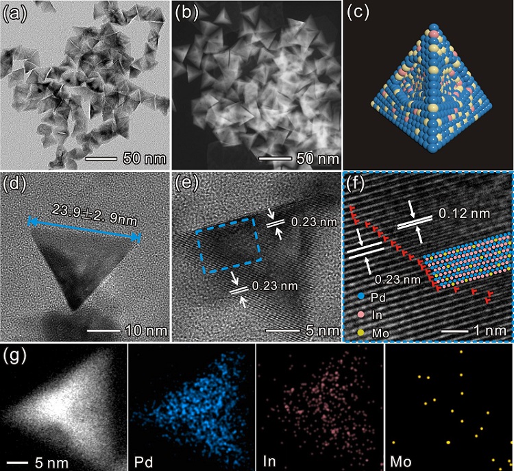 本研究采用簡單的一鍋反應法制備了凹面四面體結構的多相鈀銦鉬納米催化劑。通過簡單控制前驅體的濃度,獲得了不同組成的多相四面體鈀銦鉬納米催化劑。這些多相四面體鈀銦鉬納米催化劑由面心立方結構和金屬間結構組成。多相四面體鈀銦鉬納米催化劑在小分子醇的電催化氧化方面表現出顯著提升的性能。這些性能的增強主要來源于銦和鉬原子的氧親和性、內部多相結構的界面缺陷和金屬間結構,在其共同作用下優化了醇分子在其表面的吸脫附能,提升轉換效率。這種在鈀基合金中構筑多相界面,從而優化催化效率的方式,為高效燃料電池催化劑的設計提供了一定的參考價值。