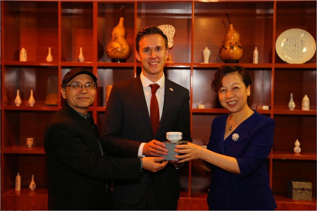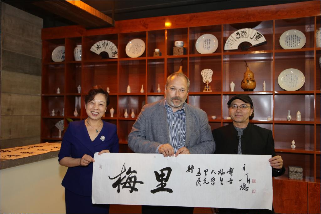 隨后,應校長雷亞萍邀請,捷克駐中國大使館政治處三等秘書Mr. Ondrej Wagner 、馬薩里克大學副校長 JUDr. Ivan Malý 和馬薩里克大學國際處處長PhDr. Jan Pavlík參觀我校書法學院,外賓對中國書法表現出極大興趣,并獲贈我校書法作品及書法文創作品。