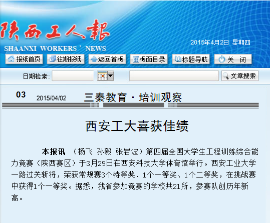 本報訊 (楊飛 孫毅 張巖波)第四屆全國大學生工程訓練綜合能力競賽(陜西賽區)于3月29日在西安科技大學體育館舉行。西安工業大學一路過關斬將,榮獲常規賽3個特等獎、1個一等獎、1個二等獎,在挑戰賽中獲得1個一等獎。據悉,我省參加競賽的學校共21所,參賽隊創歷年新高。