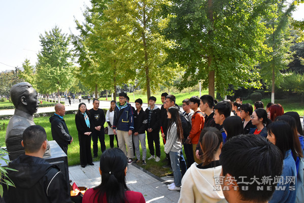 隨后,師生一行來到了圖書管南側吳運鐸雕像前,向吳運鐸雕像獻花、鞠躬,深情緬懷他對黨的建設事業的豐功偉績。兼任物理實驗室黨支部書記的理學院院長張建生現場為黨員們上了一節微黨課,教導我們新時代黨員要繼承先輩遺志,踐行“把一切獻給黨”的兵工精神。教師要鞏固育人的初心,學生要鞏固學習的初心,增強信念,為黨的事業貢獻自己的力量。