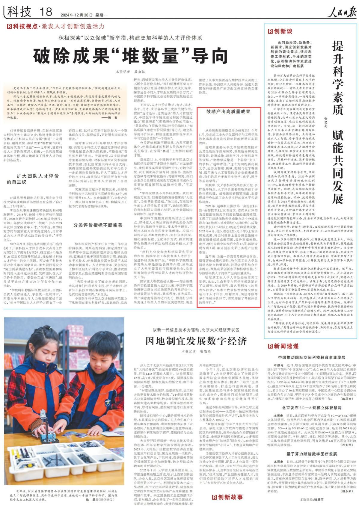 哈工大全媒體(李雙余/文)12月30日出版的《人民日報》推出“激發(fā)人才創(chuàng)新創(chuàng)造活力”系列報道,以《破除成果“堆數(shù)量”導(dǎo)向》為題介紹相關(guān)院校機構(gòu)的探索和進(jìn)展,其中報道了我校深化人才發(fā)展體制機制改革、完善考核評價體系、增強評價成果代表性,引導(dǎo)鼓勵科技人才持續(xù)產(chǎn)出高質(zhì)量成果的舉措和成效。