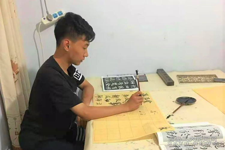 從小學(xué)習(xí)乒乓球的他,一直到現(xiàn)在都堅(jiān)持訓(xùn)練。通過不斷地練習(xí),使他在乒乓球領(lǐng)域小有成就,成為了西安工業(yè)大學(xué)乒乓球校隊(duì)的一號(hào)主力,蟬聯(lián)過兩屆新生杯男子單打冠軍,曾代表學(xué)校參加陜西省大學(xué)生乒乓球錦標(biāo)賽,并取得了雙打第五的好成績(jī)。在采訪的過程中得知,楊云淇是天生的左撇子,從小都是左手持拍打乒乓球,他的父母為了讓他在今后生活中更便捷一些,便讓他堅(jiān)持用右手寫字。大家都知道天生的習(xí)慣很難改變,但他不僅可以用右手正常寫字,還寫得一手好書法。他對(duì)行書、楷書都十分在行,他的作品還在西安工業(yè)大學(xué)一二九運(yùn)動(dòng)北郊三校書畫展中被展出。多才多藝的楊云淇對(duì)于音樂也十分喜歡,單簧管、吉他對(duì)他來說都不在話下。