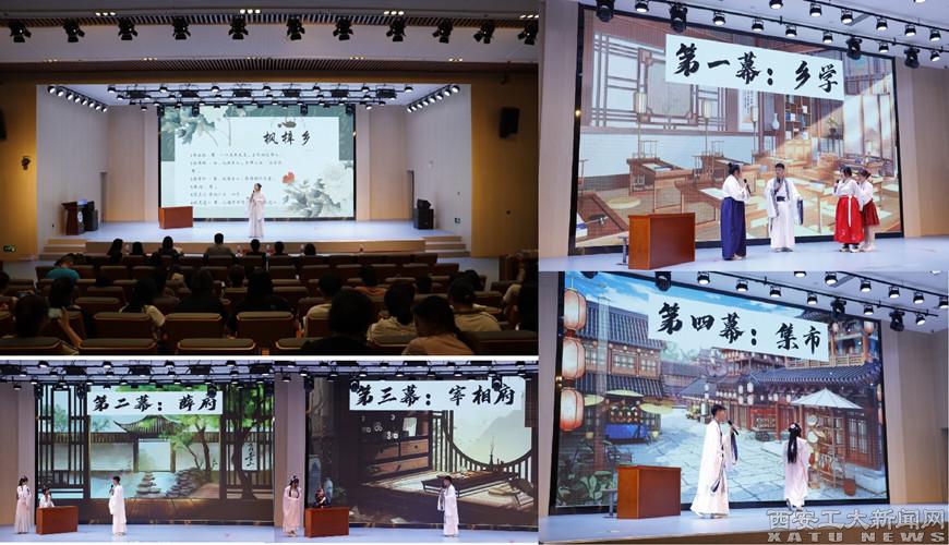 在工作人員計算比分的間隙,國學社話劇部胡方雨等十位同學表演了古風話劇《楓梓鄉》,用主人公李玉楓由單純變得世故油滑的人生經歷呼吁廣大青年堅守本心,勿失素志。